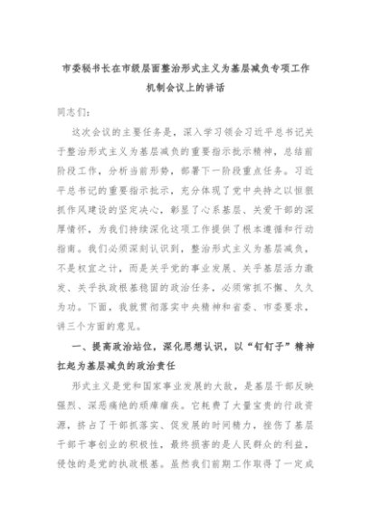 【七哥公文】2025年:市委秘书长在市级层面整治形式主义为基层减负专项工作机制会议上的讲话+更多免费公文+VX:QiGeGongWen2024