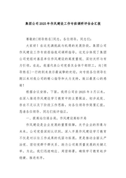 / 【七哥公文】2025年:集团公司2025年作风建设工作专班调研评估会汇报+更多免费公文+VX:QiGeGongWen2024