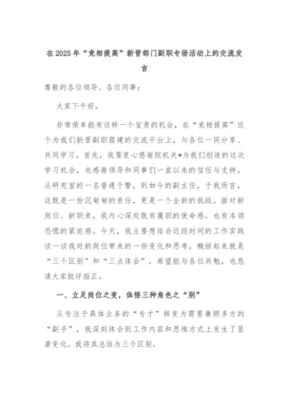 【七哥公文】2025年:在2025年“竞相提高”新晋部门副职专场活动上的交流发言+更多免费公文+VX:QiGeGongWen2024