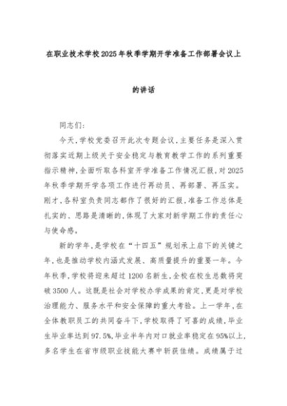【七哥公文】2025年:在职业技术学校2025年秋季学期开学准备工作部署会议上的讲话+更多免费公文+VX:QiGeGongWen2024