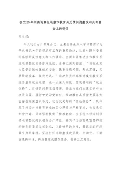 【七哥公文】2025年:在2025年州委巡察组巡察市教育局反馈问题整改动员部署会上的讲话+更多免费公文+VX:QiGeGongWen2024