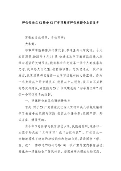 【七哥公文】2025年:评估代表在XX股份XX厂学习教育评估座谈会上的发言+更多免费公文+VX:QiGeGongWen2024