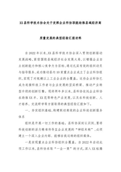 【七哥公文】2025年:XX县科学技术协会关于发挥企业科协职能助推县域经济高质量发展的典型经验汇报材料+更多免费公文+VX:QiGeGongWen2024