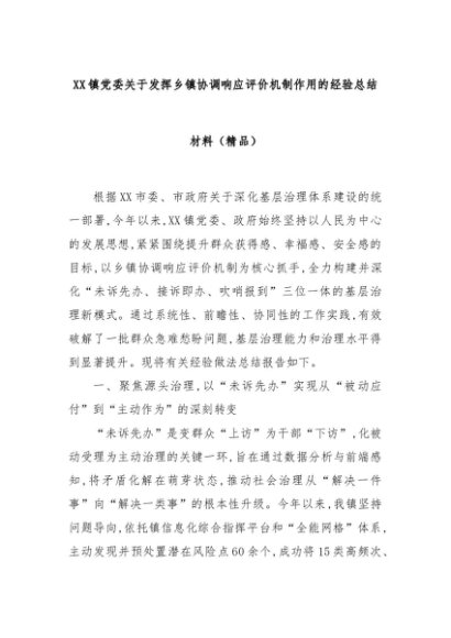 【七哥公文】2025年:XX镇党委关于发挥乡镇协调响应评价机制作用的经验总结材料(精品)+更多免费公文+VX:QiGeGongWen2024