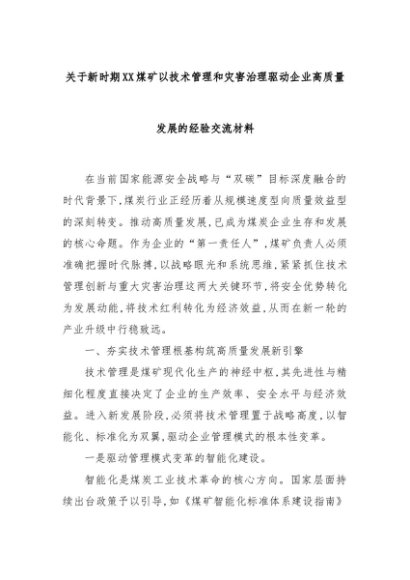 【七哥公文】2025年:关于新时期XX煤矿以技术管理和灾害治理驱动企业高质量发展的经验交流材料+更多免费公文+VX:QiGeGongWen2024