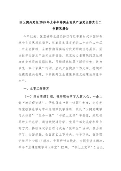 【七哥公文】2025年:区卫健局党组2025年上半年落实全面从严治党主体责任工作情况报告+更多免费公文+VX:QiGeGongWen2024