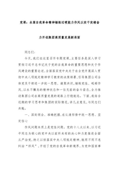 【七哥公文】2025年:党课:永葆自我革命精神锤炼过硬能力作风以实干实绩奋力开创集团高质量发展新局面+更多免费公文+VX:QiGeGongWen2024
