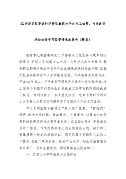 【七哥公文】2025年:XX市纪委监委派驻纪检监察组关于对市工信局、市发改委涉企执法专项监督情况的报告(精品)+更多免费公文+VX:QiGeGongWen2024
