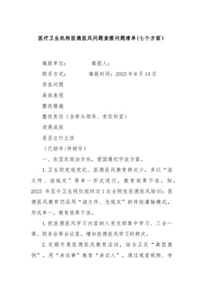 / 【七哥公文】2025年:医疗卫生机构医德医风问题查摆问题清单(七个方面)+更多免费公文+VX:QiGeGongWen2024