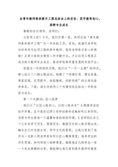 【七哥公文】2025年:在青年教师素养提升工程总结会上的发言:坚守教育初心,深耕专业成长+更多免费公文+VX:QiGeGongWen2024