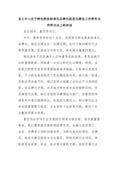 【七哥公文】2025年:在X中心关于特色美食标准化品牌化规范化建设工作研究合作研讨会上的讲话+更多免费公文+VX:QiGeGongWen2024