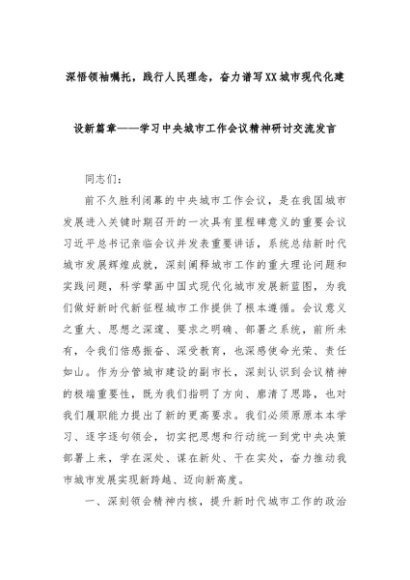 【七哥公文】2025年:深悟领袖嘱托,践行人民理念,奋力谱写XX城市现代化建设新篇章——学习中央城市工作会议精神研讨交流发言+更多免费公文+VX:QiGeGongWen2024