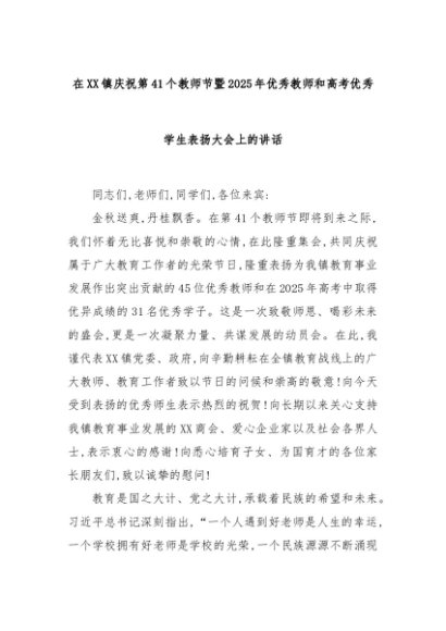 【七哥公文】2025年:在XX镇庆祝第41个教师节暨2025年优秀教师和高考优秀学生表扬大会上的讲话+更多免费公文+VX:QiGeGongWen2024