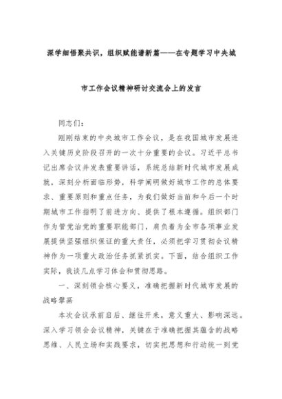 【七哥公文】2025年:深学细悟聚共识,组织赋能谱新篇——在专题学习中央城市工作会议精神研讨交流会上的发言+更多免费公文+VX:QiGeGongWen2024