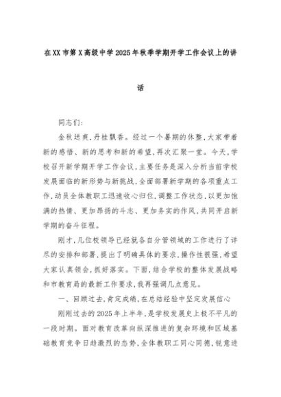 【七哥公文】2025年:在XX市第X高级中学2025年秋季学期开学工作会议上的讲话+更多免费公文+VX:QiGeGongWen2024