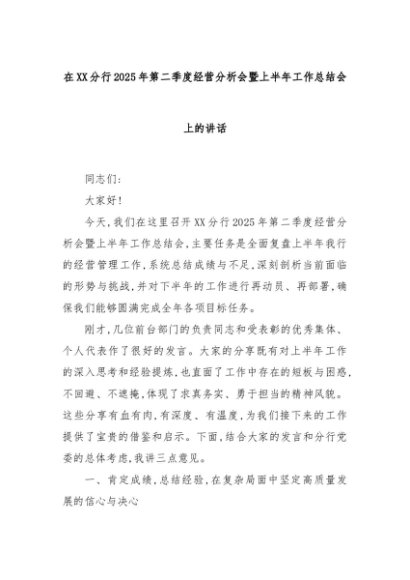 【七哥公文】2025年:在XX分行2025年第二季度经营分析会暨上半年工作总结会上的讲话+更多免费公文+VX:QiGeGongWen2024