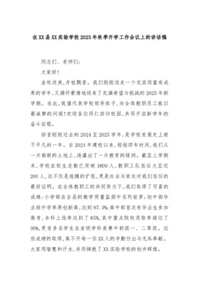 【七哥公文】2025年:在XX县XX实验学校2025年秋季开学工作会议上的讲话稿+更多免费公文+VX:QiGeGongWen2024