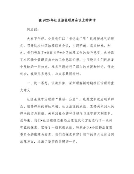 / 【七哥公文】2025年:在2025年社区治理联席会议上的讲话+更多免费公文+VX:QiGeGongWen2024