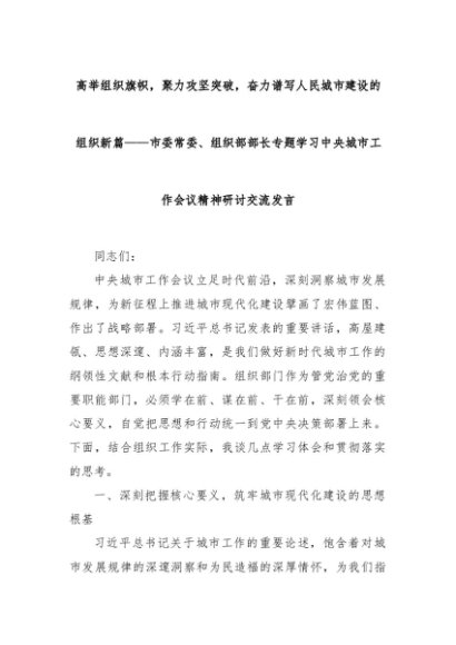【七哥公文】2025年:高举组织旗帜,聚力攻坚突破,奋力谱写人民城市建设的组织新篇——市委常委、组织部部长专题学习中央城市工作会议精神研讨交流发言+更多免费公文+VX:QiGeGongWen2024