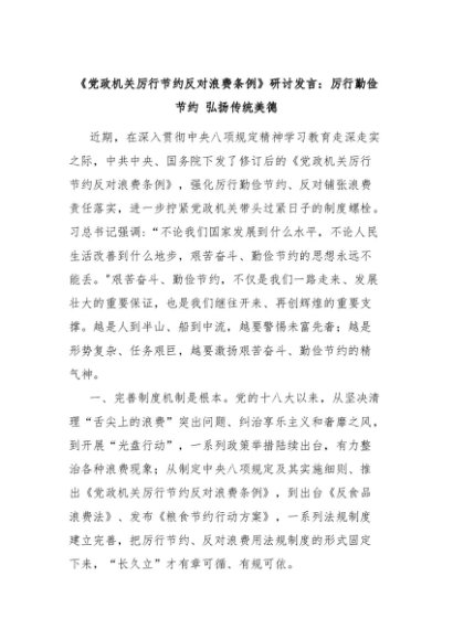 【七哥公文】2025年:《党政机关厉行节约反对浪费条例》研讨发言:厉行勤俭节约 弘扬传统美德+更多免费公文+VX:QiGeGongWen2024