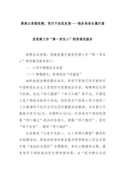 【七哥公文】2025年:聚焦主责强党建,笃行不怠促发展——税务局局长履行基层党建工作“第一责任人”职责情况报告+更多免费公文+VX:QiGeGongWen2024