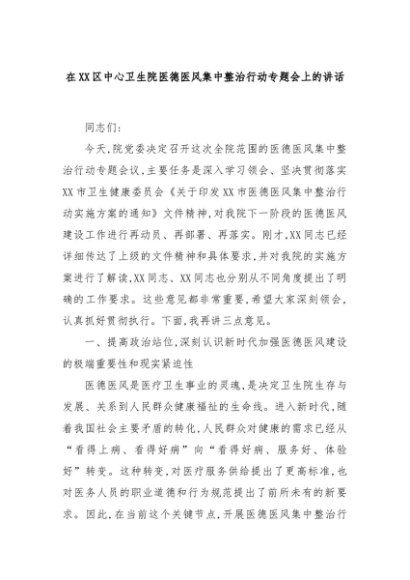 【七哥公文】2025年:在XX区中心卫生院医德医风集中整治行动专题会上的讲话+更多免费公文+VX:QiGeGongWen2024