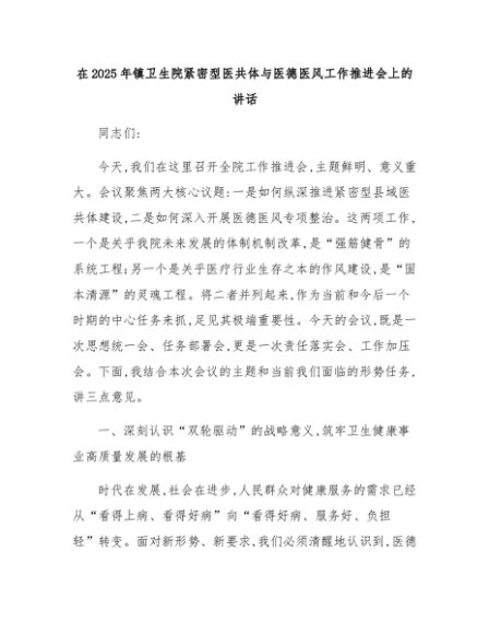【七哥公文】2025年:在2025年镇卫生院紧密型医共体与医德医风工作推进会上的讲话+更多免费公文+VX:QiGeGongWen2024