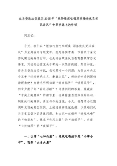 【七哥公文】2025年:在县委政法委机关2025年“根治违规吃喝顽疾涵养优良党风政风”专题党课上的讲话+更多免费公文+VX:QiGeGongWen2024