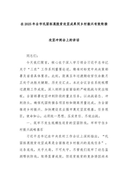 【七哥公文】2025年:在2025年全市巩固拓展脱贫攻坚成果同乡村振兴有效衔接攻坚冲刺会上的讲话+更多免费公文+VX:QiGeGongWen2024