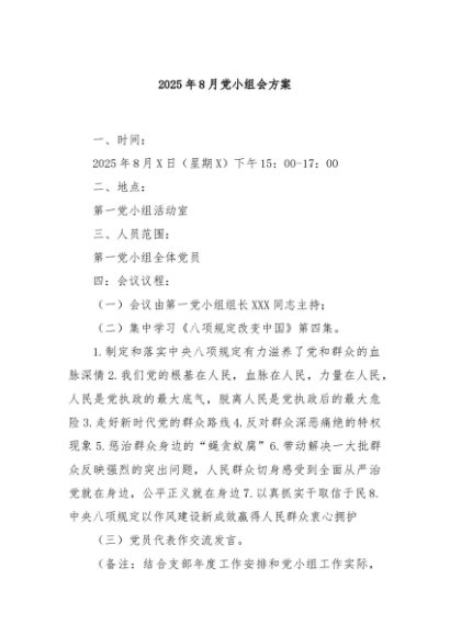 / 【七哥公文】2025年:2025年8月党小组会方案+更多免费公文+VX:QiGeGongWen2024