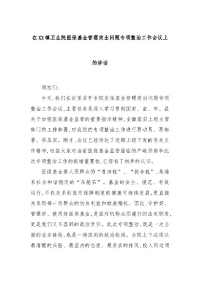 【七哥公文】2025年:在XX镇卫生院医保基金管理突出问题专项整治工作会议上的讲话+更多免费公文+VX:QiGeGongWen2024