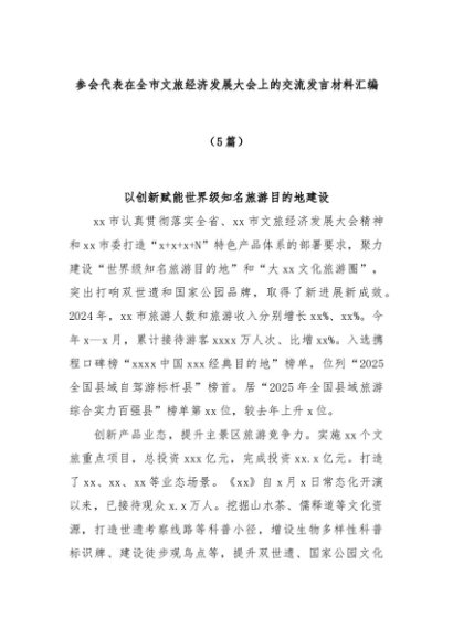 【七哥公文】2025年:(5篇)参会代表在全市文旅经济发展大会上的交流发言材料汇编+更多免费公文+VX:QiGeGongWen2024