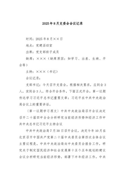 / 【七哥公文】2025年:2025年8月支委会会议记录+更多免费公文+VX:QiGeGongWen2024