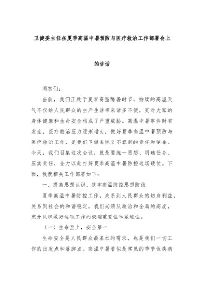 【七哥公文】2025年:卫健委主任在夏季高温中暑预防与医疗救治工作部署会上的讲话+更多免费公文+VX:QiGeGongWen2024