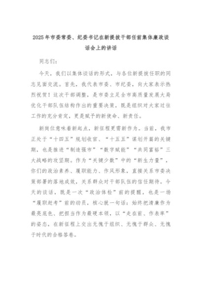 【七哥公文】2025年:2025年市委常委、纪委书记在新提拔干部任前集体廉政谈话会上的讲话+更多免费公文+VX:QiGeGongWen2024