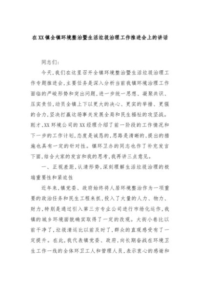 【七哥公文】2025年:在XX镇全镇环境整治暨生活垃圾治理工作推进会上的讲话+更多免费公文+VX:QiGeGongWen2024