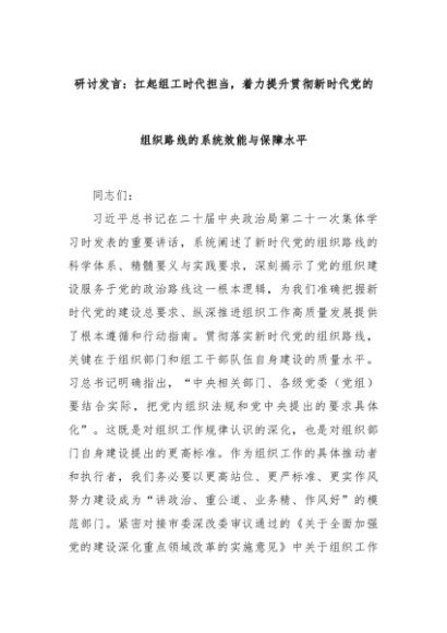 【七哥公文】2025年:研讨发言:扛起组工时代担当,着力提升贯彻新时代党的组织路线的系统效能与保障水平+更多免费公文+VX:QiGeGongWen2024