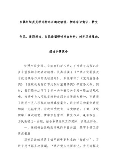 【七哥公文】2025年:乡镇组织委员学习树牢正确政绩观,树牢宗旨意识,转变作风、履职担当、为民造福研讨发言材料:树牢正确理念,担当乡镇使命+更多免费公文+VX:QiGeGongWen2024