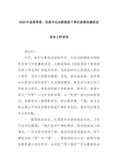 【七哥公文】2025年:2025年县委常委、纪委书记在新提拔干部任前集体廉政谈话会上的讲话+更多免费公文+VX:QiGeGongWen2024