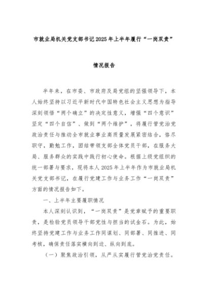 【七哥公文】2025年:市就业局机关党支部书记2025年上半年履行“一岗双责”情况报告+更多免费公文+VX:QiGeGongWen2024
