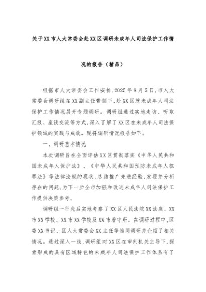 【七哥公文】2025年:关于XX市人大常委会赴XX区调研未成年人司法保护工作情况的报告(精品)+更多免费公文+VX:QiGeGongWen2024