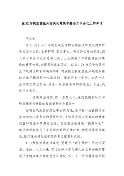 【七哥公文】2025年:在XX分院医德医风有关问题集中整治工作会议上的讲话+更多免费公文+VX:QiGeGongWen2024