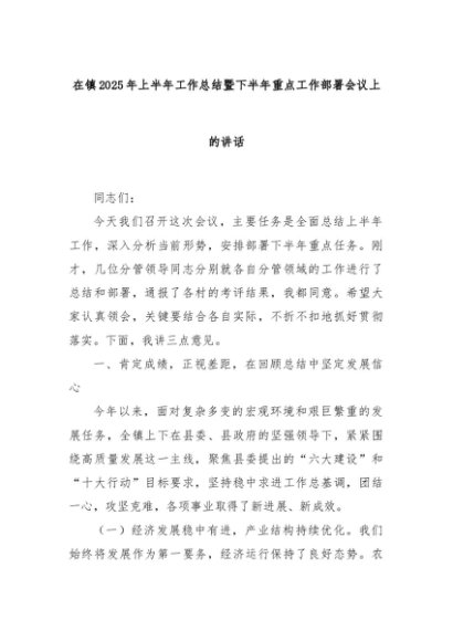 【七哥公文】2025年:在镇2025年上半年工作总结暨下半年重点工作部署会议上的讲话+更多免费公文+VX:QiGeGongWen2024