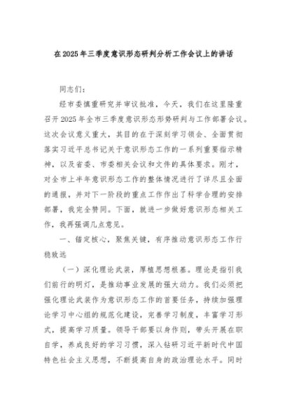 【七哥公文】2025年:在2025年三季度意识形态研判分析工作会议上的讲话+更多免费公文+VX:QiGeGongWen2024