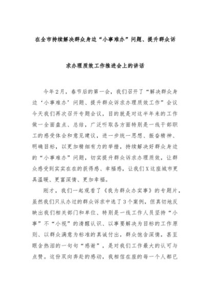 【七哥公文】2025年:在全市持续解决群众身边“小事难办”问题、提升群众诉求办理质效工作推进会上的讲话+更多免费公文+VX:QiGeGongWen2024
