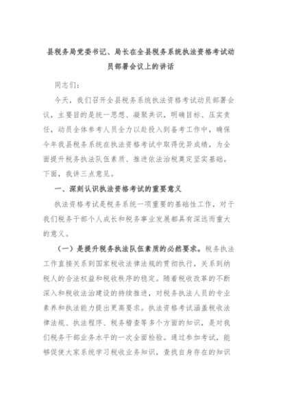 【七哥公文】2025年:县税务局党委书记、局长在全县税务系统执法资格考试动员部署会议上的讲话+更多免费公文+VX:QiGeGongWen2024