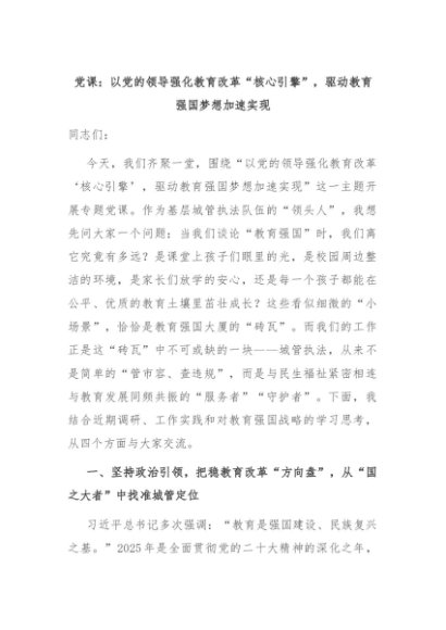 【七哥公文】2025年:党课:以党的领导强化教育改革“核心引擎”,驱动教育强国梦想加速实现+更多免费公文+VX:QiGeGongWen2024