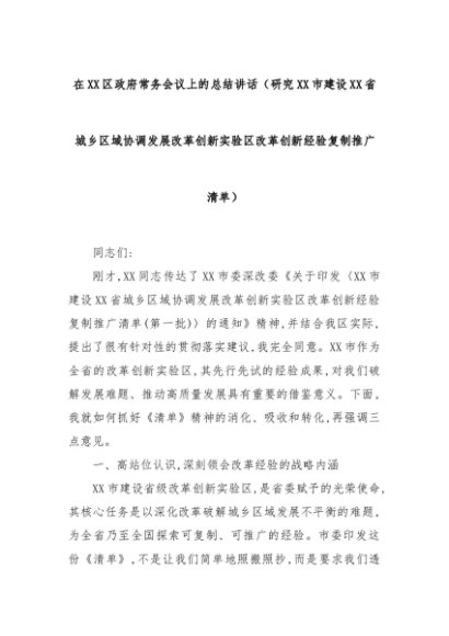 【七哥公文】2025年:在XX区政府常务会议上的总结讲话(研究XX市建设XX省城乡区域协调发展改革创新实验区改革创新经验复制推广清单)+更多免费公文+VX:QiGeGongWen2024