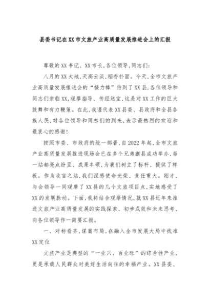 【七哥公文】2025年:县委书记在XX市文旅产业高质量发展推进会上的汇报+更多免费公文+VX:QiGeGongWen2024