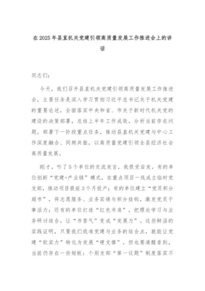 【七哥公文】2025年:2025年县直机关党建引领高质量发展工作推进会上的讲话+更多免费公文+VX:QiGeGongWen2024